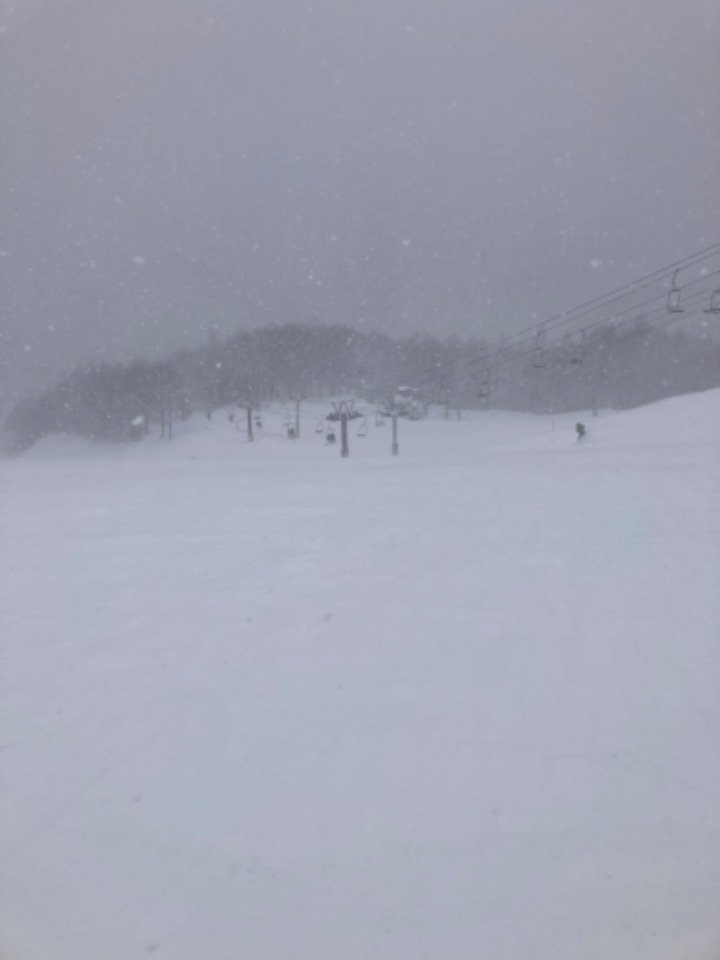 シーズン終盤だというのに本降りの雪。パウダーでしたが、視界不良。スキー後は温泉に入って帰りました。